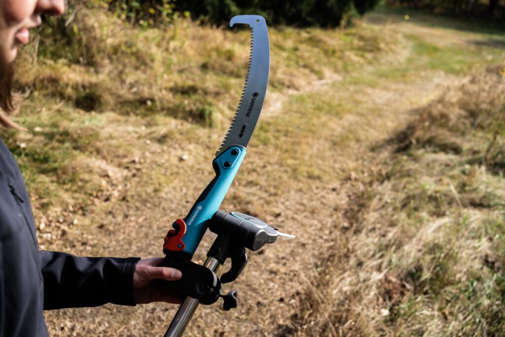Für stärkere Äste wird die Säge per Adapter klickfest aufgesetzt – die Führung bleibt präzise, die Schnittkante sauber. Für das sichere Herunterziehen der Äste wird der Räumhaken eingesetzt.